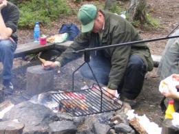 Po minięciu diabelskiego drzewka docieramy do miejsca biwakowego. Jest to kolejna różnica w stosunku do Polski, zamiast zabraniać biwakowania w parku, zostało specjalnie przygotowane do tego celu miejsce, wyposażone w piec z naczyniami, skład drewna, kominek i krąg ogniskowy z grillem. Rozmowy, pieczenie kiełbaski, upajanie się pięknem przyrody... tak minęły nam około 2 godziny. Przewodnik nie ruszył się z miejsca dopóki wszystko nie zostało posprzątane - co można było spalić, to do ogniska, a pozostałe rzeczy zabieramy ze sobą. Przywiązanie Finów do czystości środowiska potwierdziła odpowiedz na pytanie czy można spalić plastikowa butelkę, która nie była na kaucje - dlaczego, przecież można ja użyć jeszcze wielokrotnie... U nas było by to zbieractwo, tutaj przejaw dbania o środowisko naturalne.