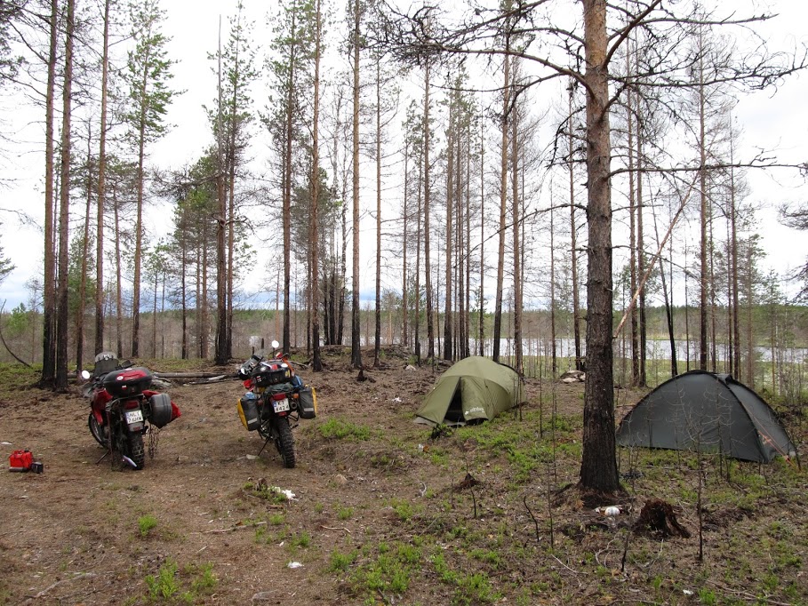 Następnego dnia rozpoczynamy maraton - powoli tęsknota za domem wygrywa. Żegnamy się z Krzyśkiem, który ma jeszcze urlop, siadamy na motocykle i jedziemy do oporu. Na wylotówce mijamy charakterystycznie wyglądającą autostopowiczkę - niestety nie ma jak jej zabrać ze sobą. W trasie okazuje się, że mijamy się wiele razy - to na stacji, to w barze... Po którymś kolejnym razie i ona zaczyna rozpoznawać nas. Pierwszy nocleg mamy gdzieś na dziko, przy drodze, po przejechaniu ponad 800km. Zjeżdżamy z M18. Nawierzchnia szybko zmienia się w szutrową. Po całym dniu jazdy i wielu kilometrach czuć zmęczenie. Jedziemy ostrożnie, żeby nie narobić sobie kłopotów na sam koniec. Dojeżdżamy do jeziora. Niestety ktoś już wpadł na ten sam pomysł wcześniej... Dużo wcześniej... Wioska tam jest. Jedziemy dalej, aż znajdujemy wypalony kilka lat temu fragment lasu.